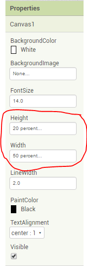 Next, we need to adjust the properties of the Canvas and the ImageSprite. Adjust the Height and Width of the Canvas to a size that is big enough to hold the rotated control. For this example, I set these to a Height of 20 percent and a Width of 50 percent.