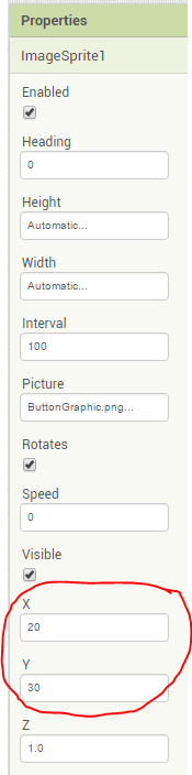 The ImageSprite needs to be moved within the Canvas so that we will have room for the image to rotate around through 360 degrees of rotation. Here, we set the X and Y coordinates to position the ImageSprite. For reference, the point at the upper left of the Canvas is coordinate [0,0]. The X-value [X-value, Y-value] increases as we move to the right in the Canvas and the Y-value increases we move downwards in the canvas.