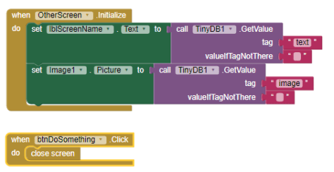 The code that implements OtherScreen, reads the text label value from TinyDB and also reads the name of the image file to display. The latter is assigned to the Picture property of the Image control.