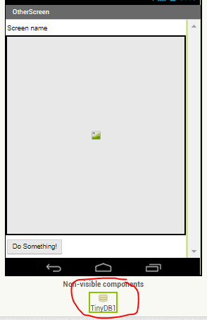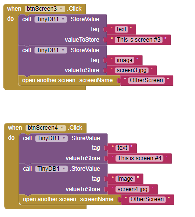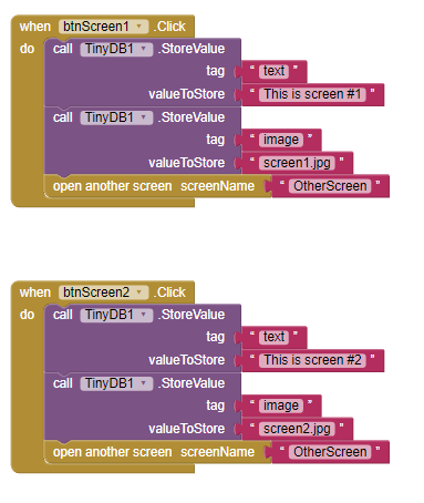 The values “This is screen #1” and “screen1.jpg” are then passed to OtherScreen by storing them in TinyDB.
