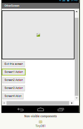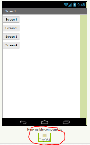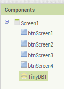 Drag 4 buttons on to the screen, change their text value to Screen 1, Screen 2 and so on, and rename them to btnScreen1, btnScreen2 and so on. Also drag a TinyDB component onto the screen. TinyDB is needed to pass data from Screen1 to our second screen – in App Inventor apps, each screen is like a miniature self contained app and has its own set of variables that are not shared with other screens.