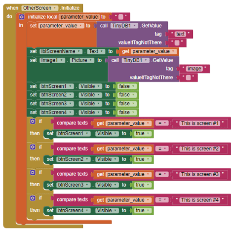 Then, we look at the text parameter value to determine which of the four screen we are supposed to show. If we are showing screen #1, then we set btnScreen1.Visible to true, while all the other buttons remain invisible.