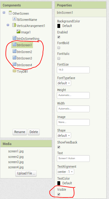 We do this by using the property “Visible“. You may not have realized but controls can be marked as invisible and then do not appear on screen. In this way, we can design our screen to have several buttons, one for each “Screen” and make all the unneeded ones (for a specific screen like Screen1 – invisible).